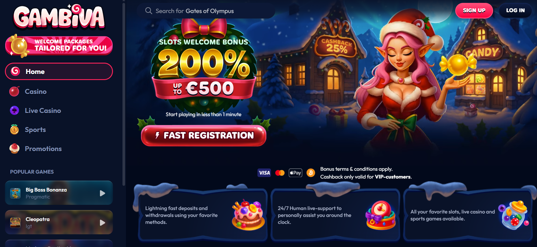 - Bonuses and Promotions: New players can claim a welcome bonus of 200% up to £500, which may not be the highest among welcome bonuses, but it is still a solid option. In addition, Gambiva Casino features lotteries with excellent prizes and rakebacks, as well as a VIP club with cashbacks on losses and other benefits for members.