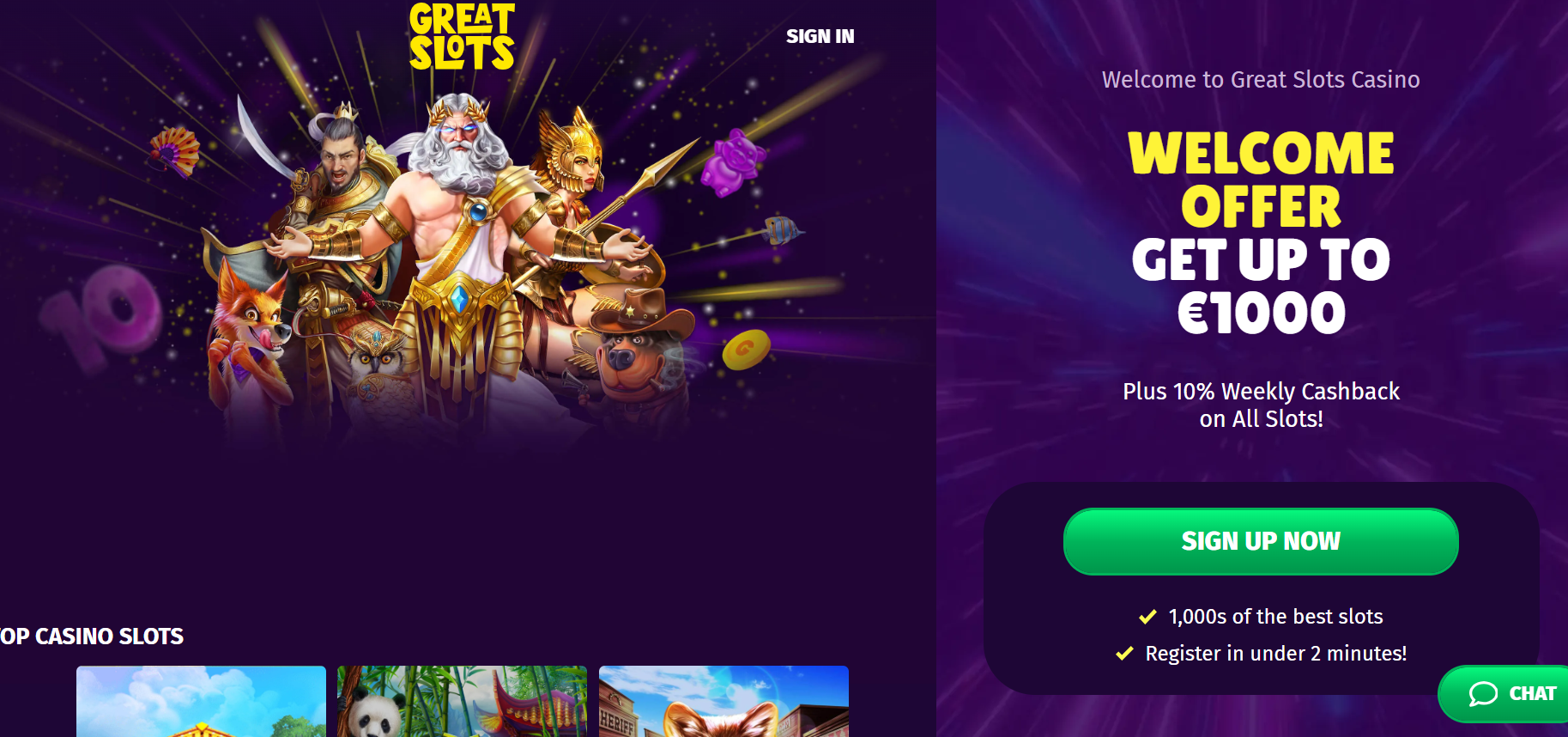 - Great Slots – Welcome Bonus of Up to £1,000 and 10% Cashback on Slot Games.