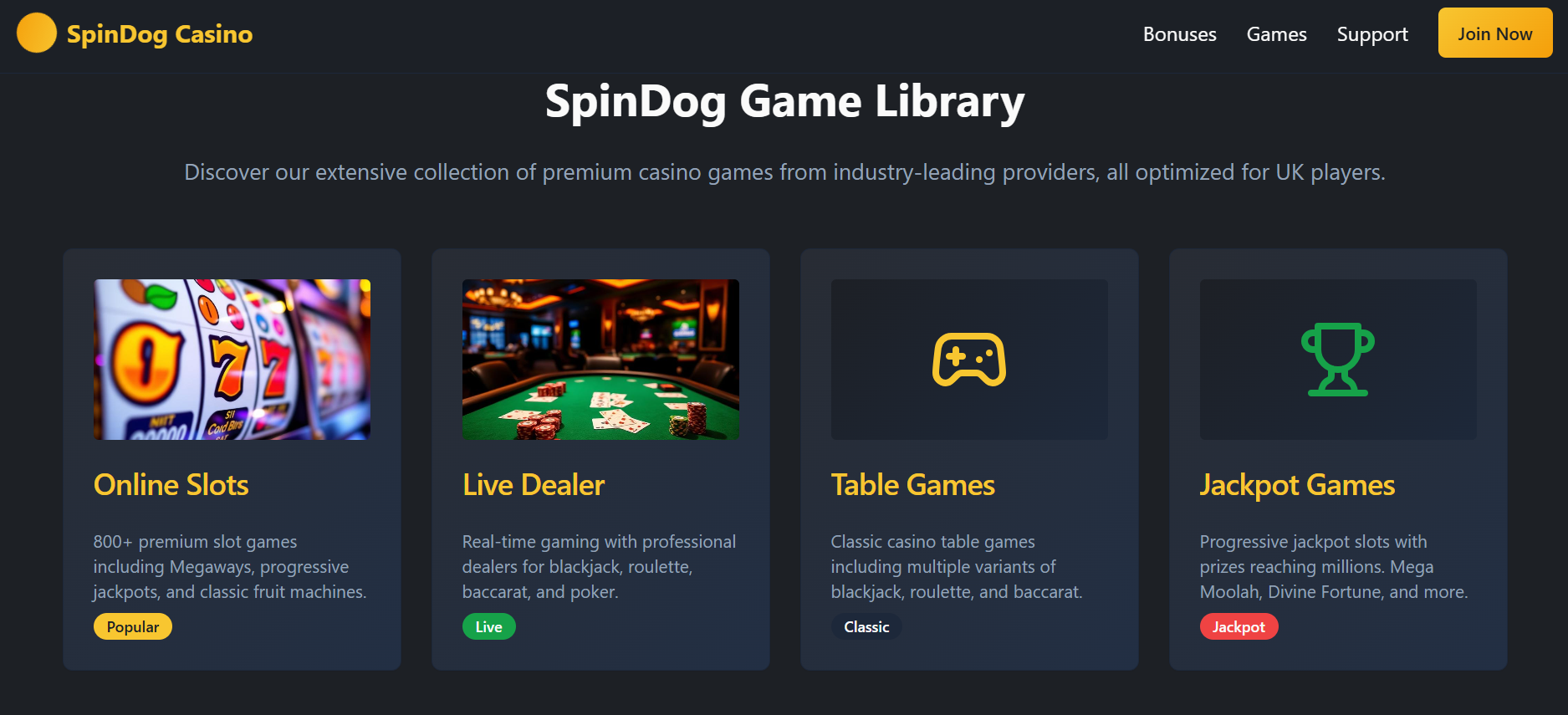 - Game Selection: When it comes to the gaming variety, SpinDog presents a wide range of options. Players can enjoy games not on Gamstop, such as slots, table games like blackjack and baccarat, a live dealer section with exciting games, game shows and casual games.